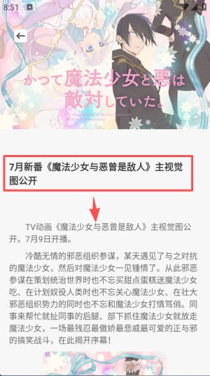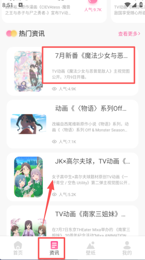 1、进入 “资讯” 页面的热门资讯板块,能看到 “7 月新番《魔法少女与恶是敌人》” 的相关信息。