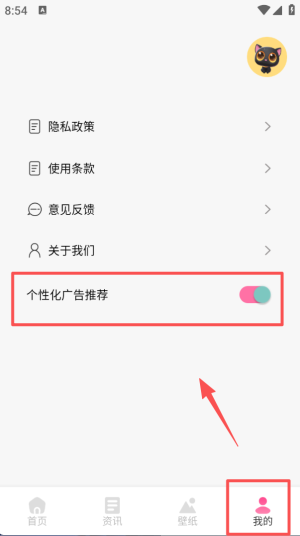 4、进入 “我的” 页面,可找到 “个性化广告推荐” 的开关选项,以及意见反馈等功能入口。
