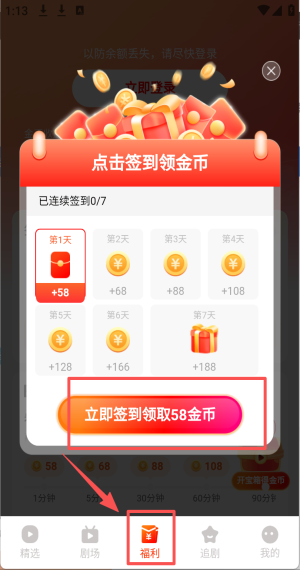 3、在福利页面,点击“立即签到领取58金币”领取金币。