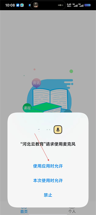1、“河北云教育”请求麦克风权限时,选择【使用应用时允许】,授予权限以支持语音功能。