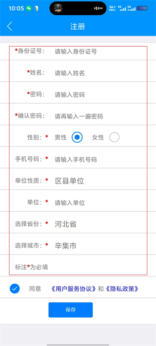 4、在注册页,按要求填写身份证号、姓名等必填信息,勾选协议后点击【保存】,完成账号注册。