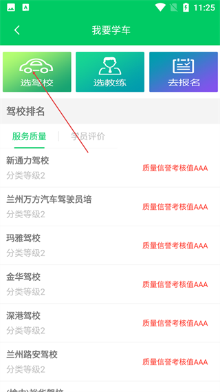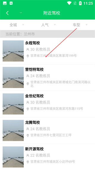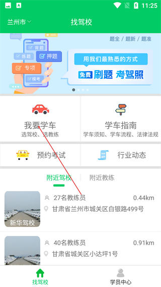 2、在“我要学车”页,可查看驾校排名,或点击【附近驾校】,筛选当前城市(兰州市)的周边驾校列表。