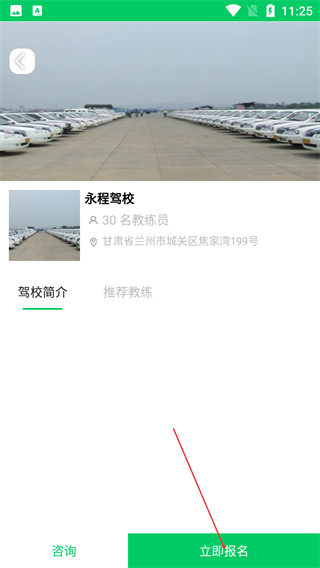 4、在驾校详情页,可查看简介、推荐教练,点击【立即报名】完成学车报名操作,也可点击【咨询】获取更多信息。
