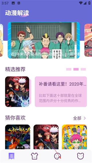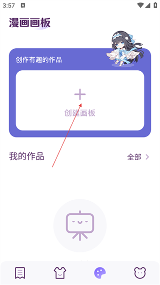 1、在软件首页可浏览动漫解读、精选推荐等内容,点击底部画板按钮可进入漫画画板界面。