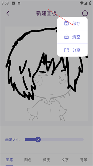 4、创作完成后,可点击右上角功能按钮,选择【保存】选项保存作品,也可选择清空或分享作品。