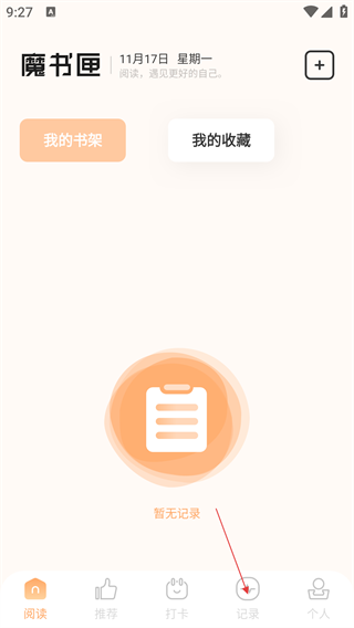 1、进入【魔书匣】后,点击底部【记录】,进入随心记录页面。