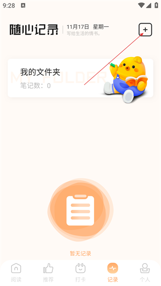 2、在随心记录页面点击右上角加号,进入添加笔记页面。