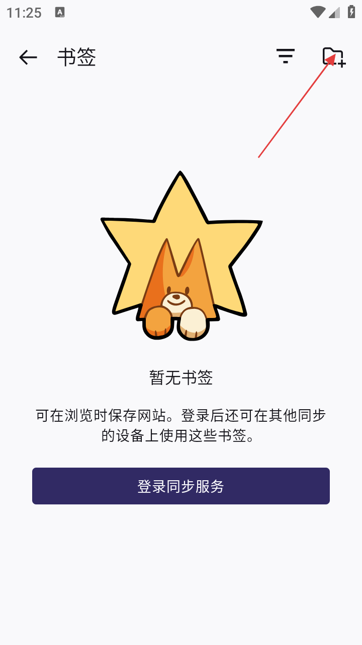 3、进入书签页面后,若要整理书签,可点击右上角新建文件夹图标,开始创建书签文件夹流程。