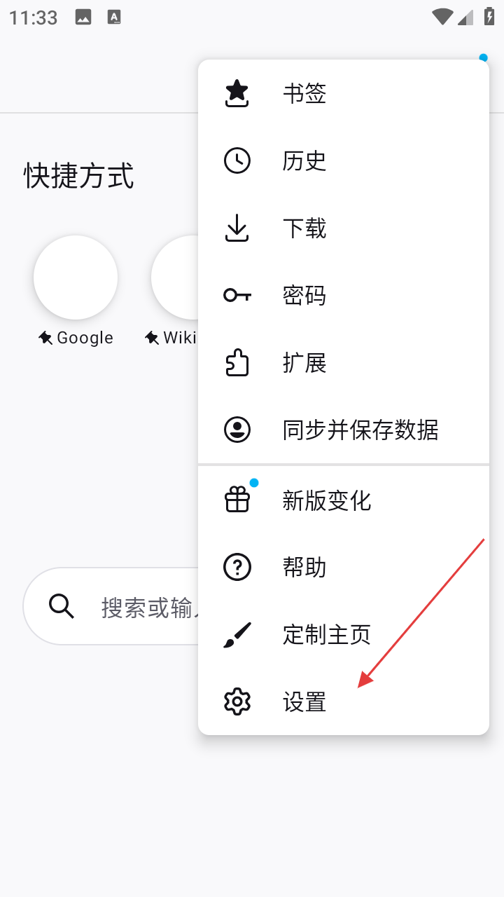 2、在展开的菜单里,找到并点击【设置】选项,进入设置页面,准备进行浏览器相关设置。