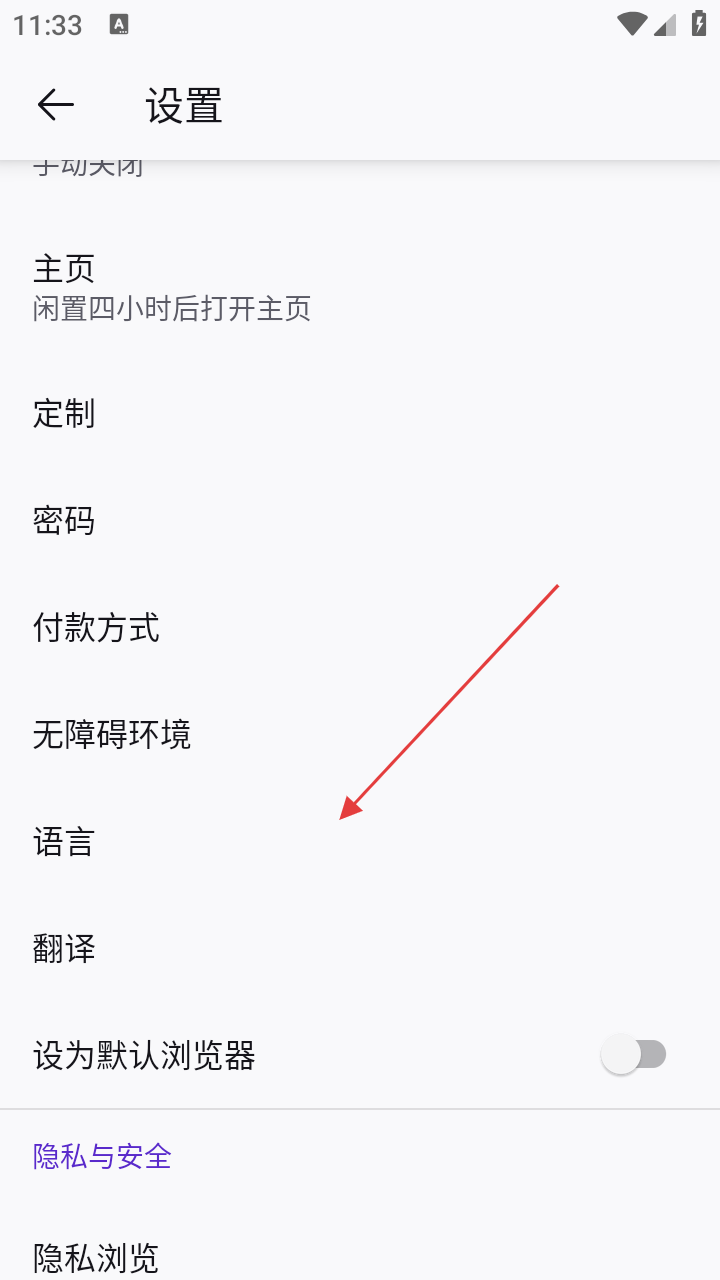 3、进入设置页面后,找到【语言】选项并点击,进入语言设置界面,可对浏览器语言进行调整。