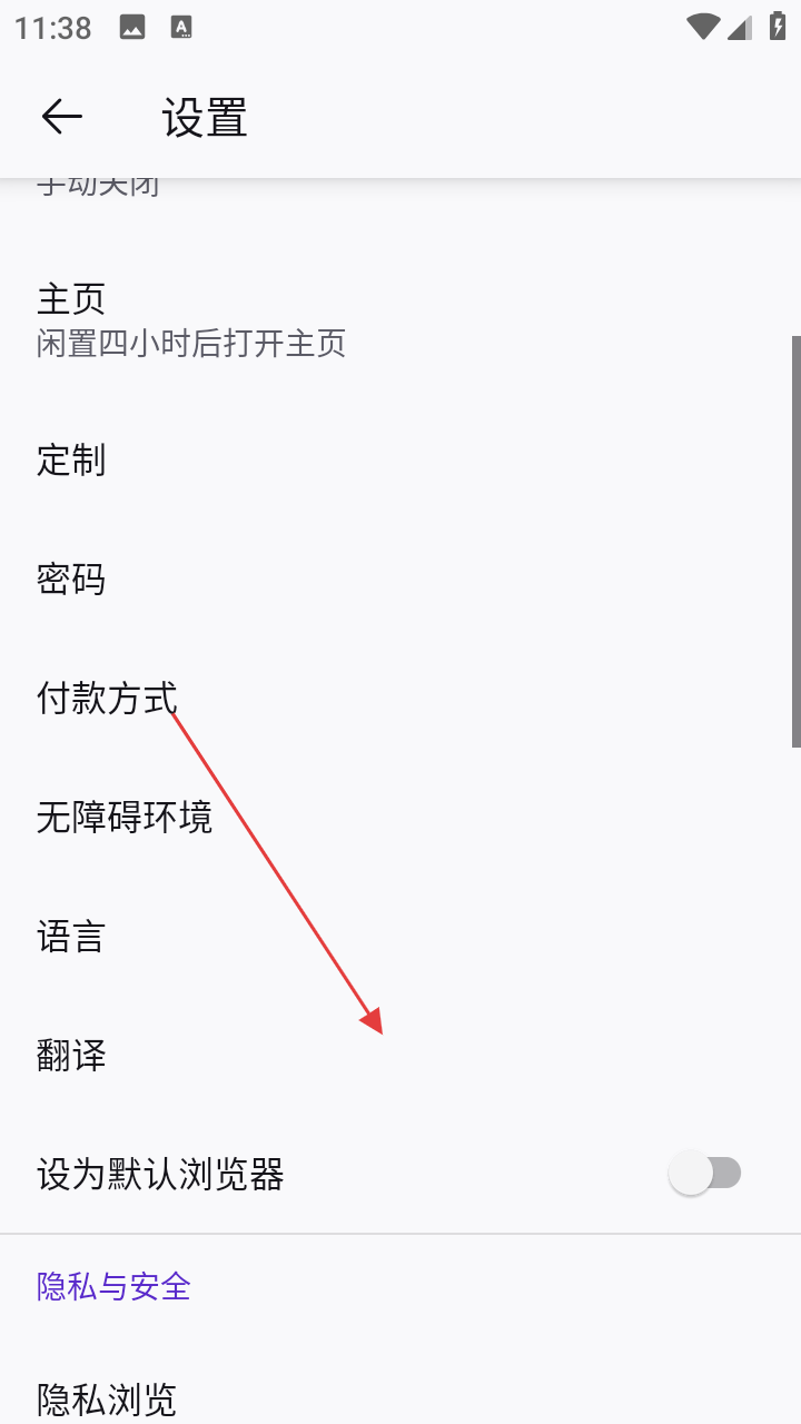 3、进入设置页面后,找到【翻译】选项并点击,进入翻译设置界面,可对翻译功能进行调整。