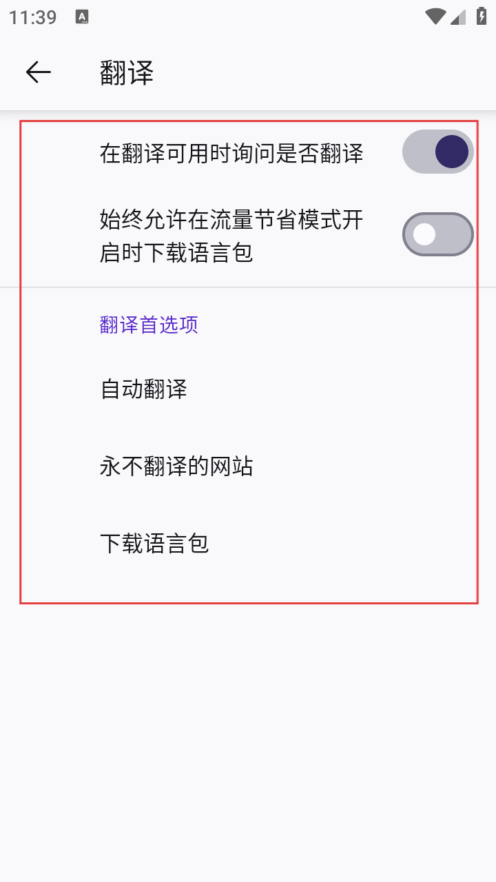 4、在翻译设置界面,可设置【在翻译可用时询问是否翻译】等选项,也能管理语言包下载等翻译相关内容。