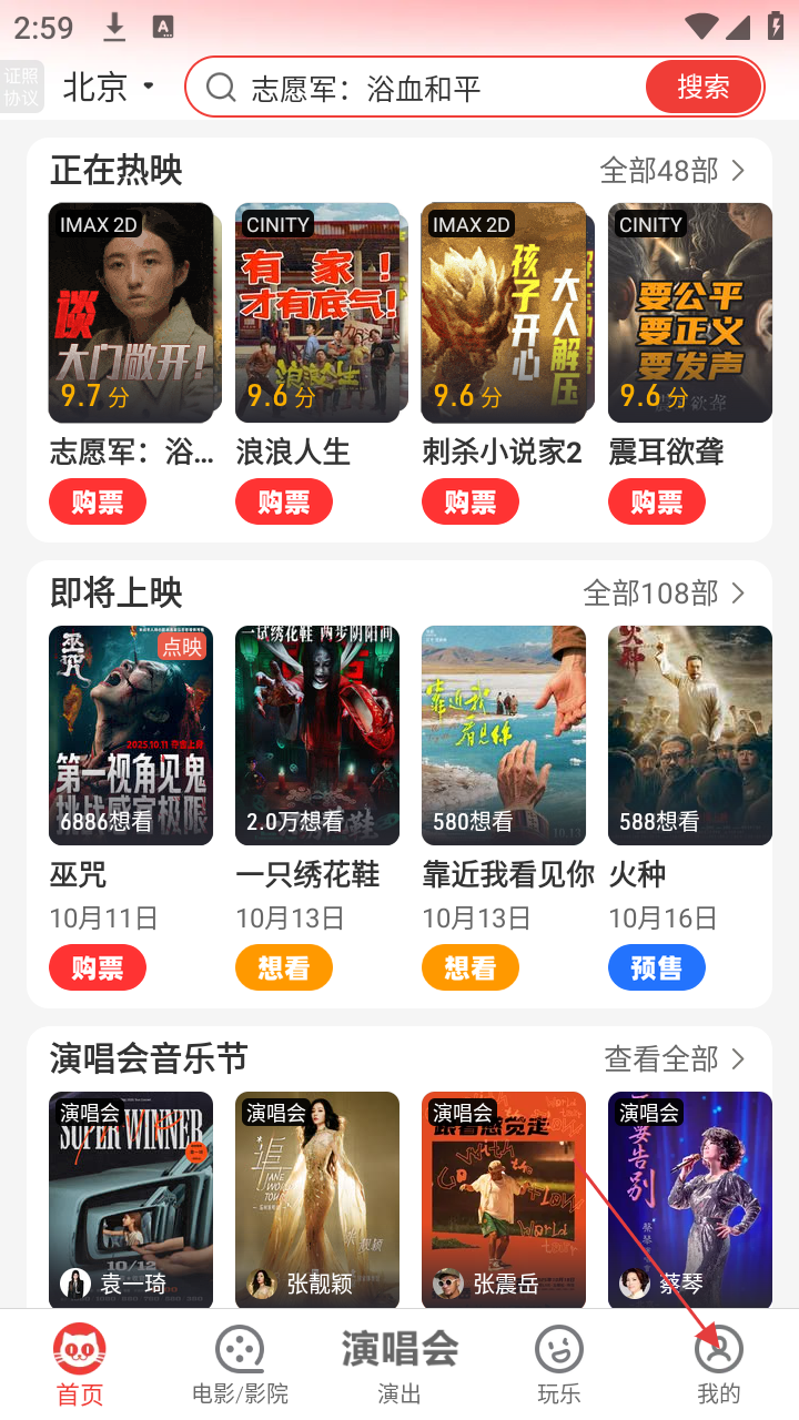 1、打开猫眼电影,首页有正在热映、即将上映的影片及演唱会音乐节等板块,可浏览各类文娱内容。