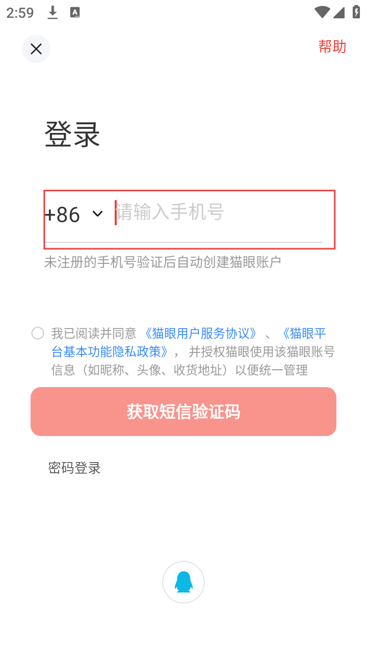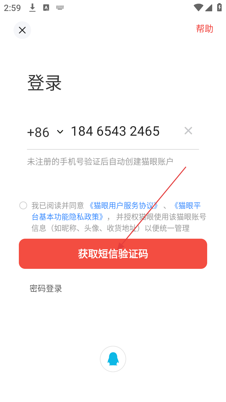 4、输入手机号后,勾选协议,点击【获取短信验证码】,即可获取验证码完成后续登录流程。