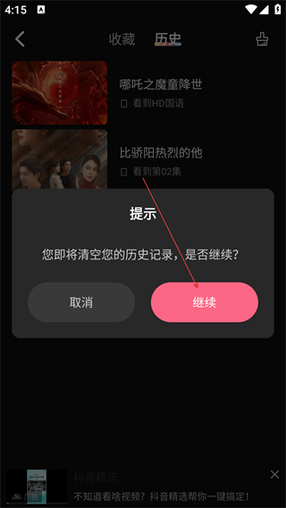 4、在清空历史记录提示弹窗中,点击【继续】按钮可清空历史记录,若暂不清空可选择【取消】。