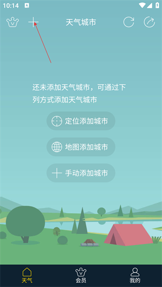 1、进入“天气城市”页面,点击顶部“+”按钮,进入城市管理界面。
