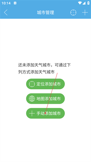 2、在城市管理页,选择“手动添加城市”(或定位、地图添加),进入添加城市页面。