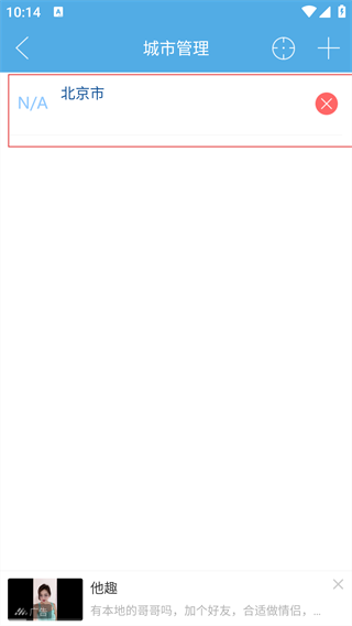 4、添加后返回城市管理页,可看到已添加的城市(如“北京市”),点击右侧“×”可删除该城市。