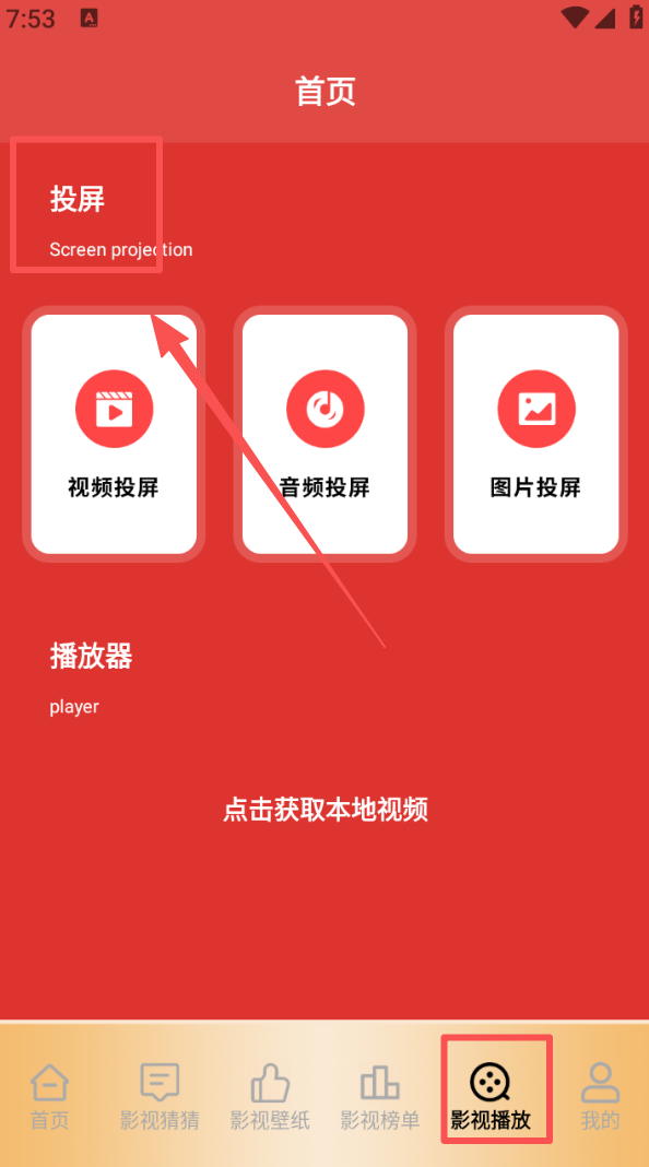 3、进入影视播放界面,可选择视频、音频、图片投屏功能,实现多设备影音共享。