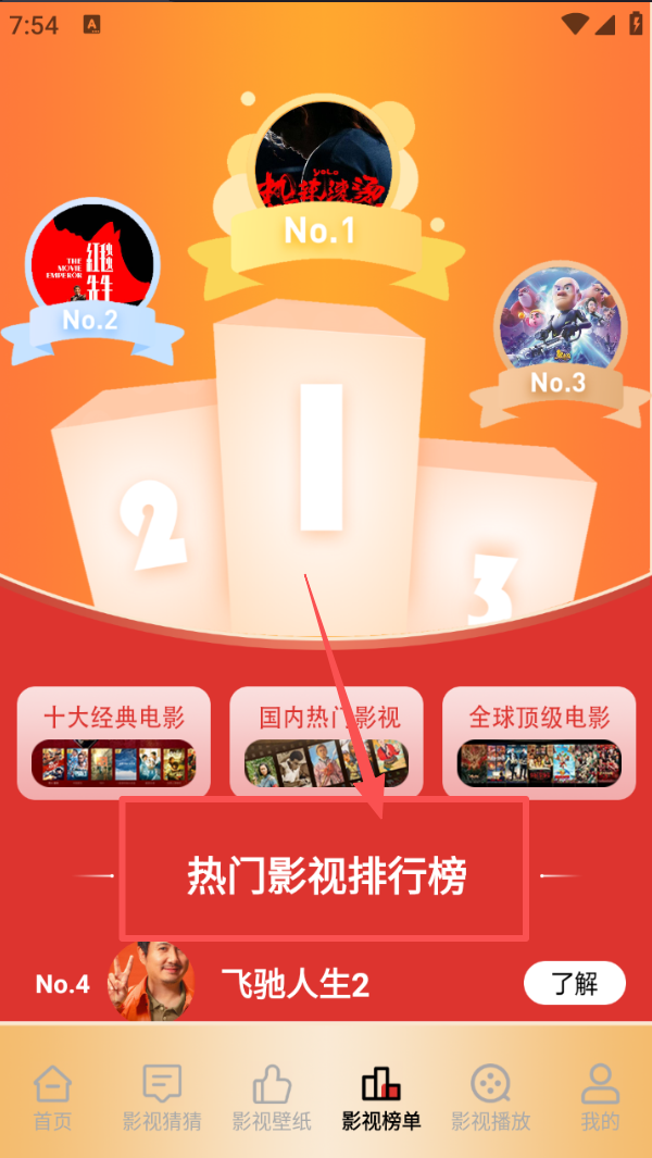 4、打开影视榜单页面,能查看热门影视排行榜,了解当下热门影视动态。