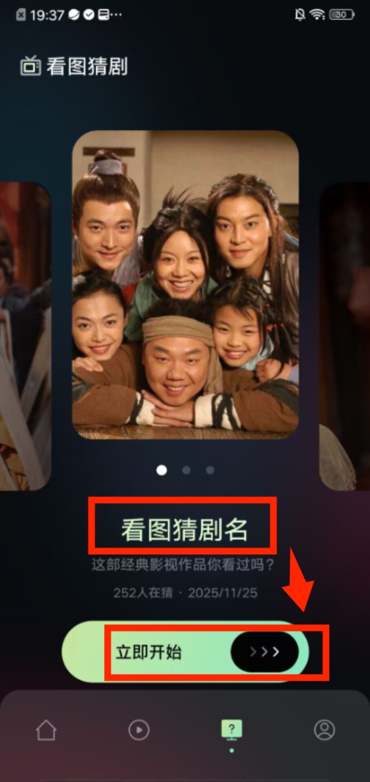 3、打开 “看图猜剧” 页面,点击 “立即开始”,进入根据剧照猜测影视剧名的互动环节。