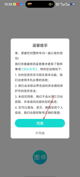 1、首次进入应用,点击“温馨提示”弹窗中的“同意”,进入背词主界面。