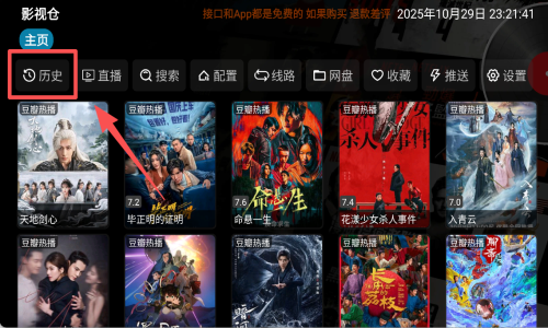 1、在影视仓首页点击“历史”标签,查看您的观影历史记录。