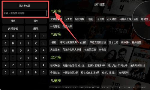 4、在搜索页面点击“指定搜索源”输入框,输入关键词搜索影视内容。