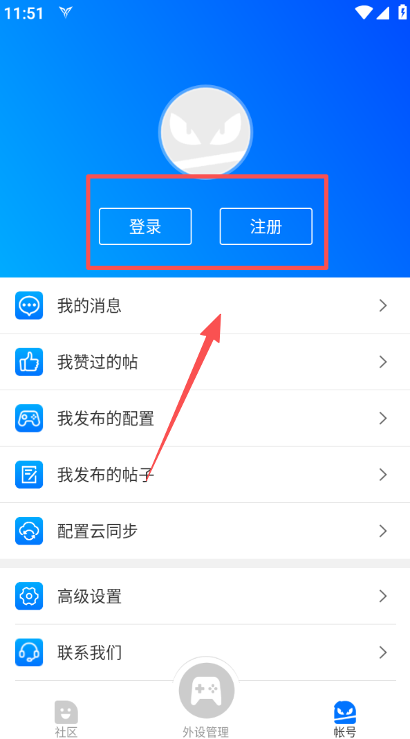 3、切换至帐号页面,能看到登录与注册选项,点击后可进行帐号相关操作。