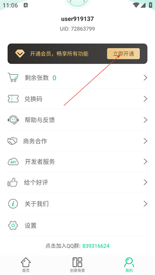 2、进入【我的】页面后,若想畅享所有功能,可点击【立即开通】会员。