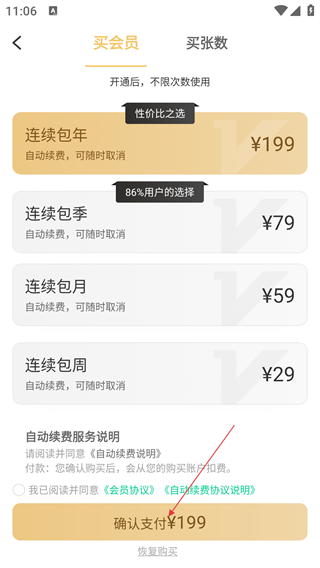 3、在买会员页面,有连续包年、包季、包月、包周多种套餐可选,选好后勾选同意协议,点击【确认支付】即可,如选连续包年需支付¥199。
