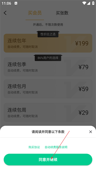 4、支付会员前,会弹出请阅读并同意条款的提示,需点击【同意并继续】,确认同意购买协议和自动续费协议说明后才能完成支付流程。