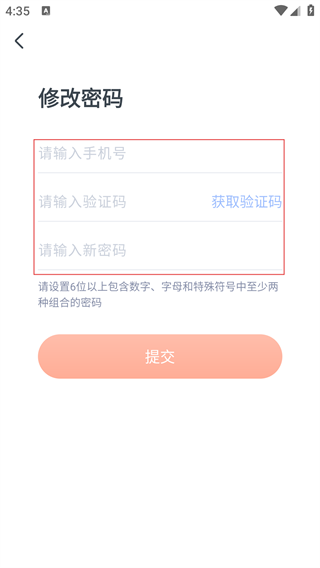 4、在修改密码界面,依次输入手机号、获取并填写验证码、设置符合要求的新密码,最后点击【提交】完成密码修改。