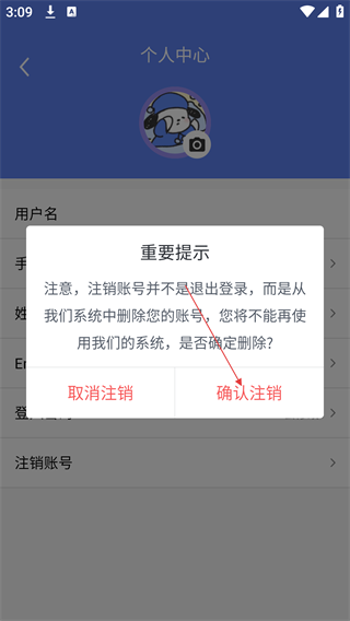 4、在“重要提示”弹窗中,确认注销会删除账号且无法使用系统后,点击【确认注销】完成操作。