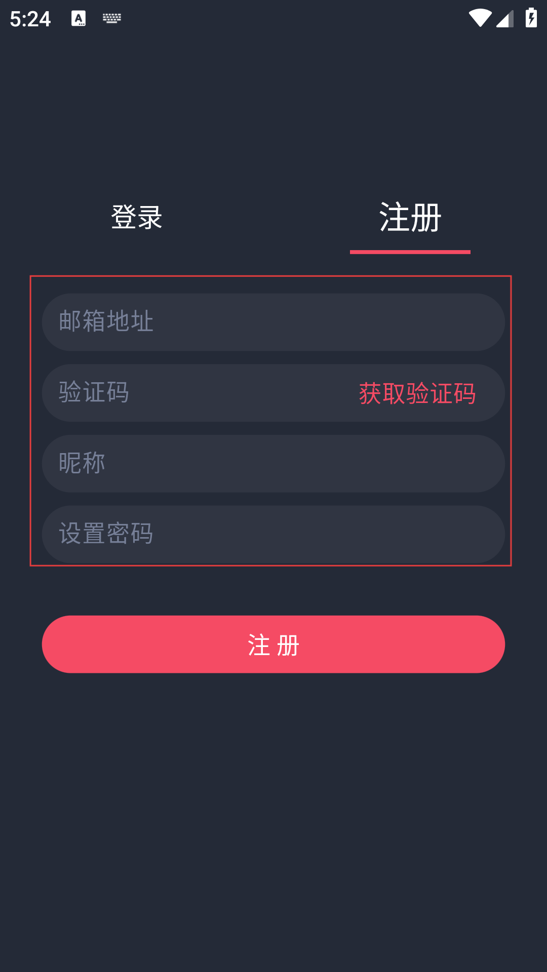 4、在注册界面,输入邮箱地址、获取验证码、设置昵称和密码后完成注册。