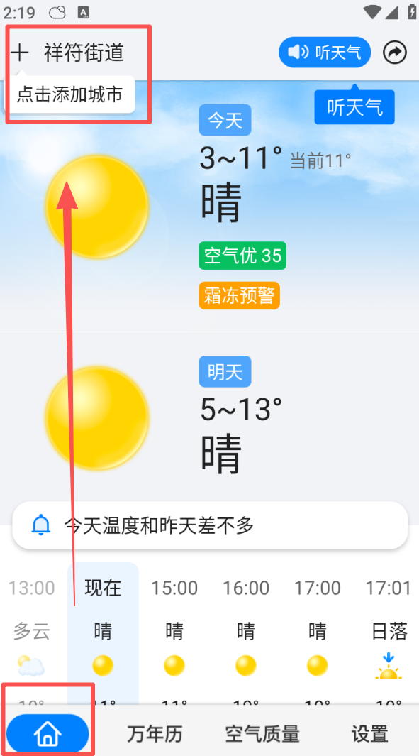 1、进入首页,点击左上角 “+” 号添加城市,即可查看对应区域的实时天气、气温及预警信息。