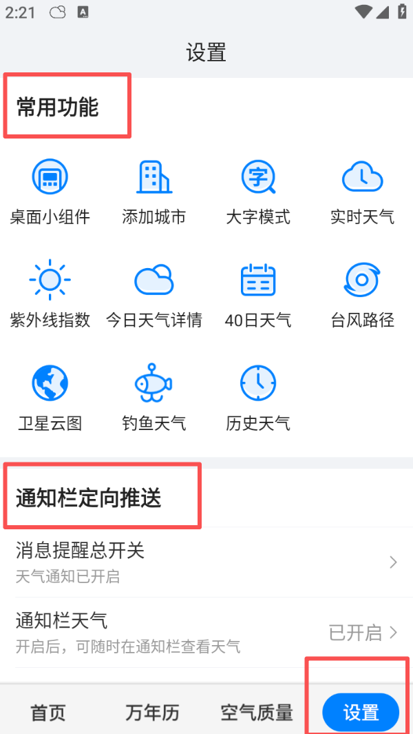 4、进入 “设置” 页面,在常用功能里选择所需工具,也能管理通知栏推送,定制天气提醒。