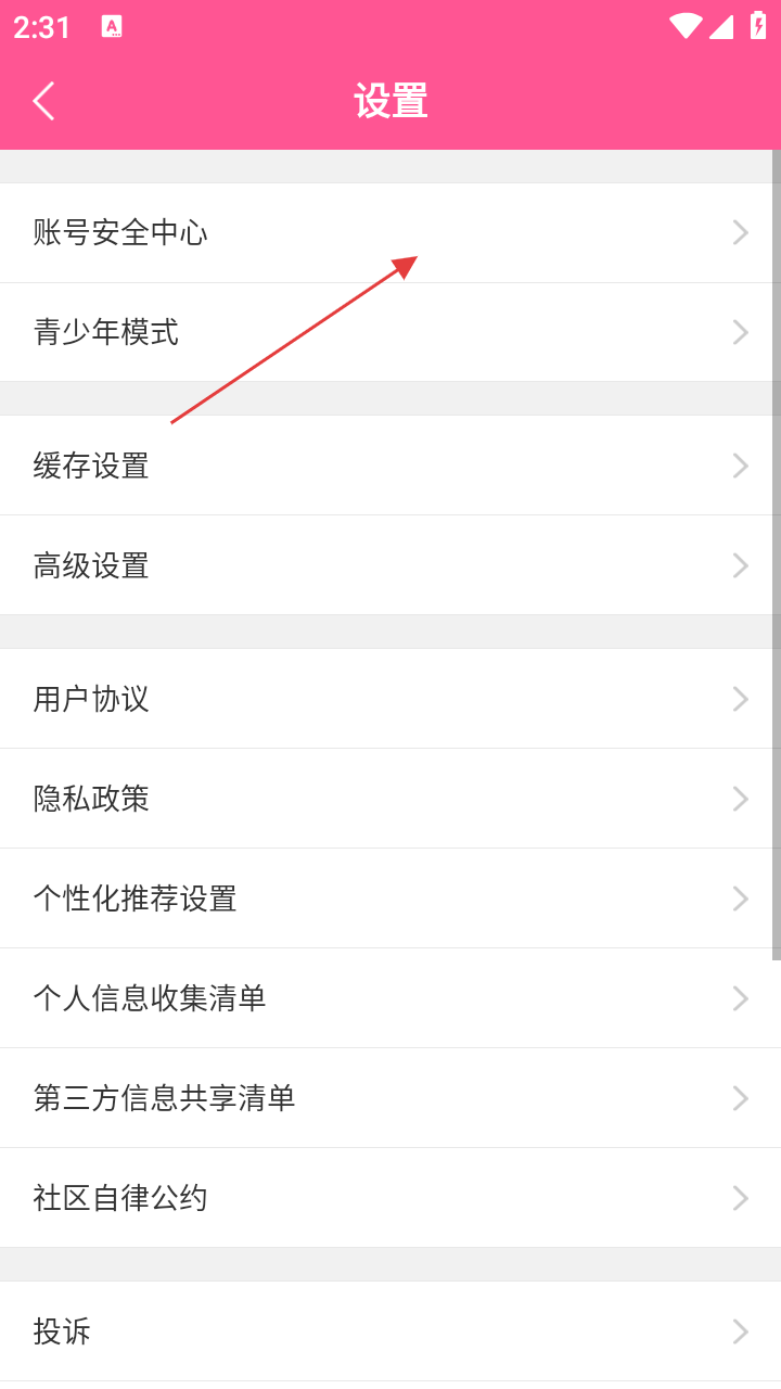 3、在设置界面,找到并点击【账号安全中心】选项,进入账号安全中心页面。