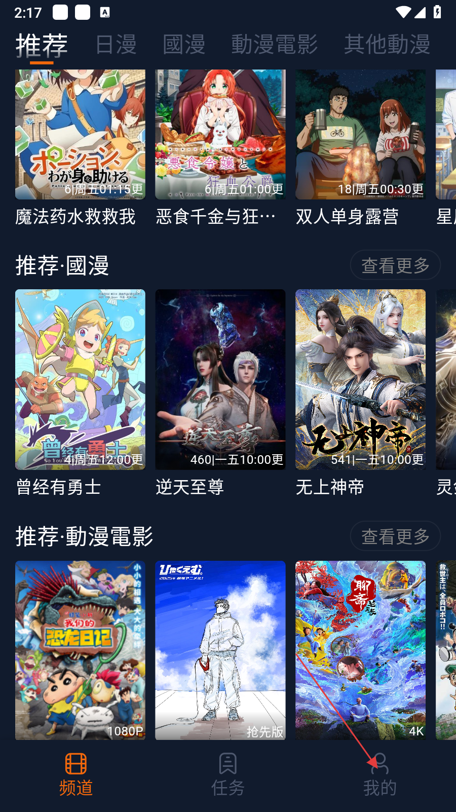 1、进入软件后可在【频道】页,按【日漫】【國漫】【動漫電影】等分类查找喜欢的动漫,方便快速定位内容。