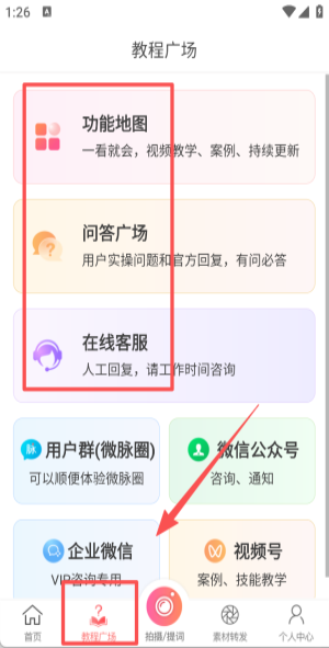 2、进教程广场看案例视频,遇疑问直接问答广场或在线客服。