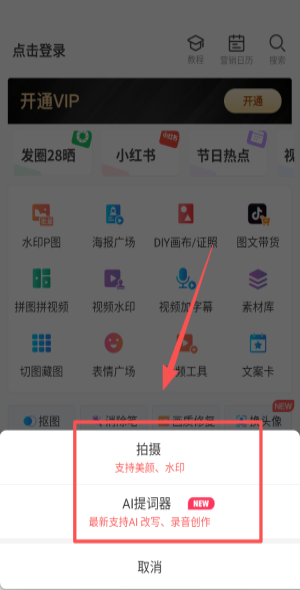 3、回首页点“开通VIP”,再选水印P图或AI提词器开始创作。