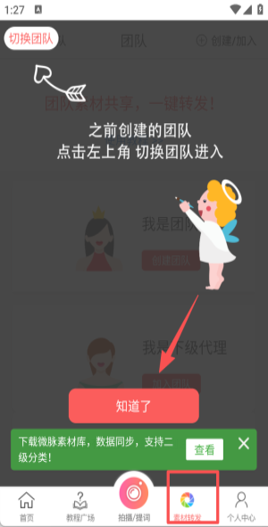 4、切换团队后一键转发素材,同步微脉素材库实现二级分类。