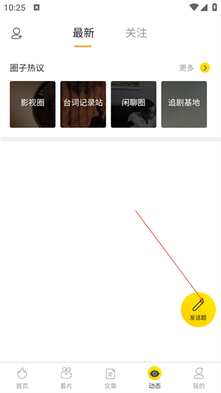 2、在【动态】页面,点击右下角黄色【发话题】按钮,进入发布话题界面,可创作影视话题内容。