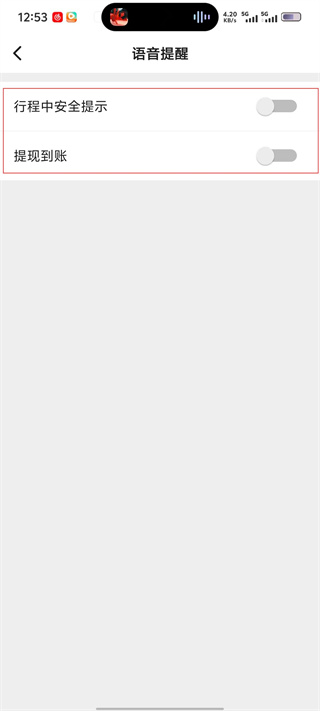 4、在语音提醒页面,按需开启“行程中安全提示”“提现到账”等功能的开关,完成语音提醒设置。