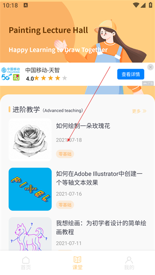 3、进入【课堂】板块,可参与【进阶教学】,如学习【如何绘制一朵玫瑰花】等课程,提升绘画技能。