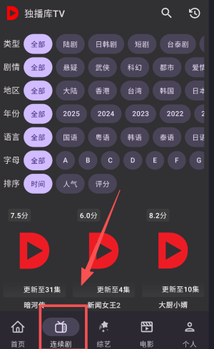 2、若想查看连续剧,点击底部“连续剧”,可根据类型、剧情、地区等多种条件筛选剧集。