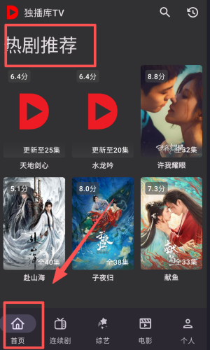 1、打开独播库TV,点击底部“首页”,即可看到热剧推荐板块,方便快速浏览热门剧集。