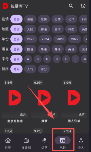 4、若想看电影,点击底部“电影”,可通过剧情、地区、语言等筛选条件找到想看的电影。