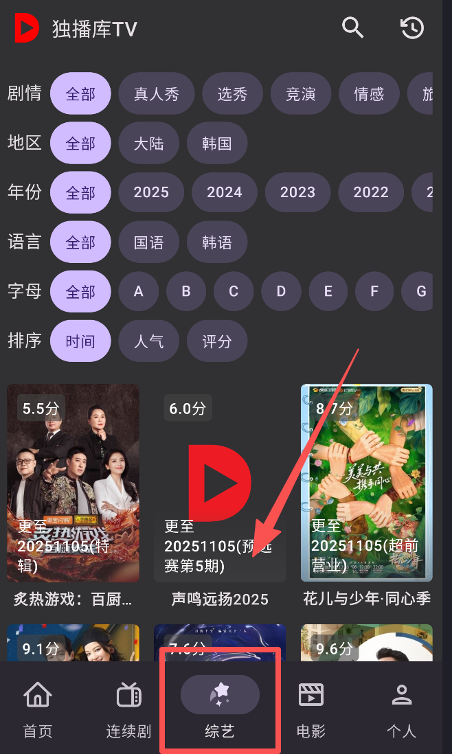 3、要是对综艺感兴趣,点击底部“综艺”,能按照剧情、地区、年份等分类查找心仪综艺。