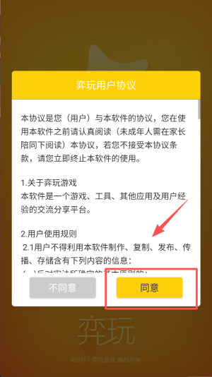 1、使用弈玩软件前,需仔细阅读弈玩用户协议,若认可条款则点击 “同意” 按钮。